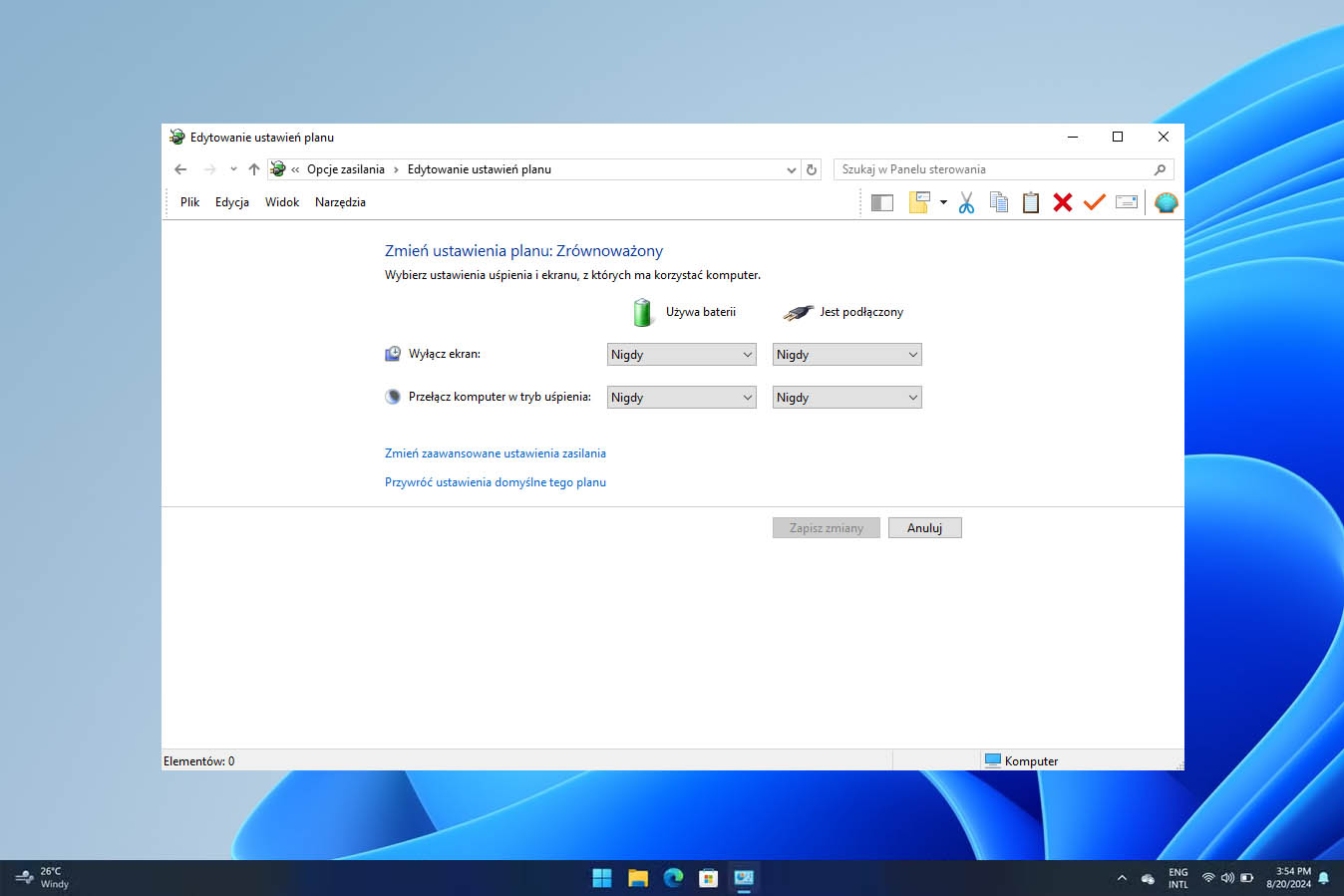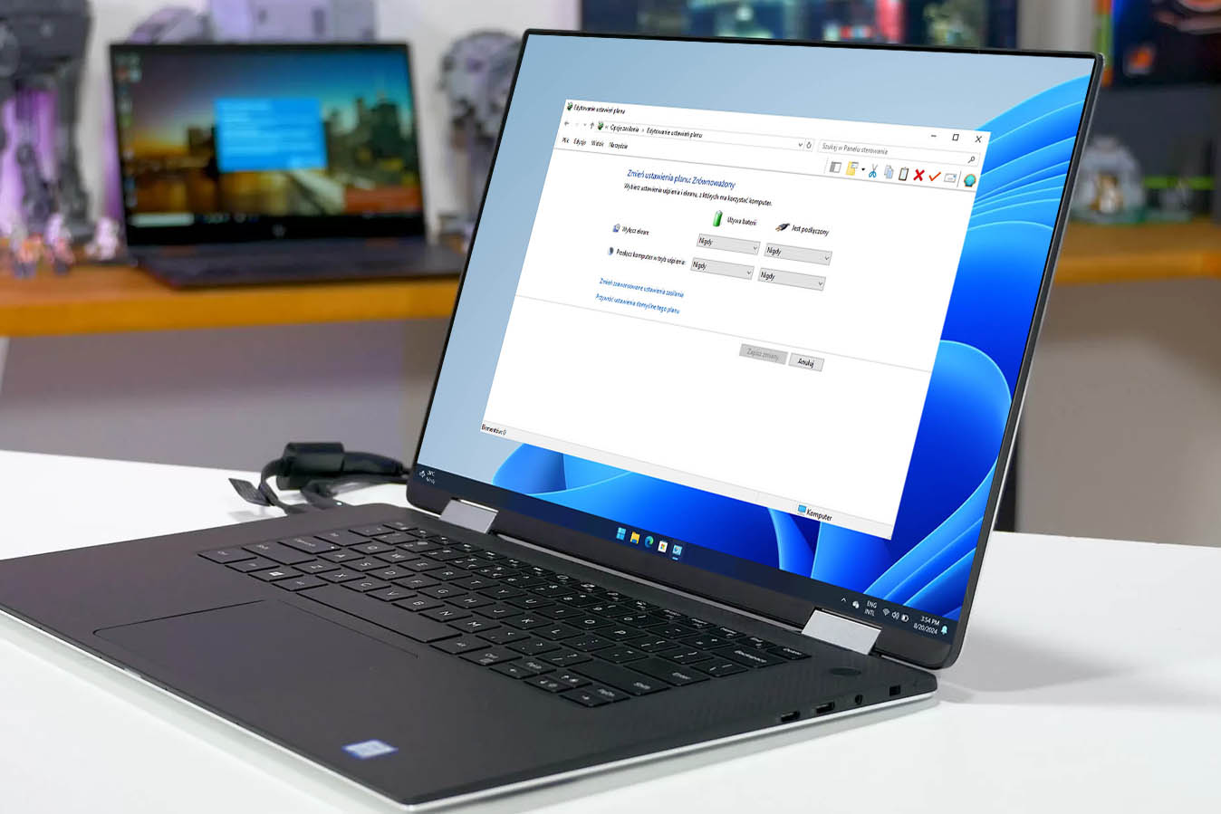 - Plan zrównoważony – kompromis między wydajnością a czasem pracy na baterii. Laptop działa płynnie, ale nie wyrzuca z siebie wszystkiego od razu.